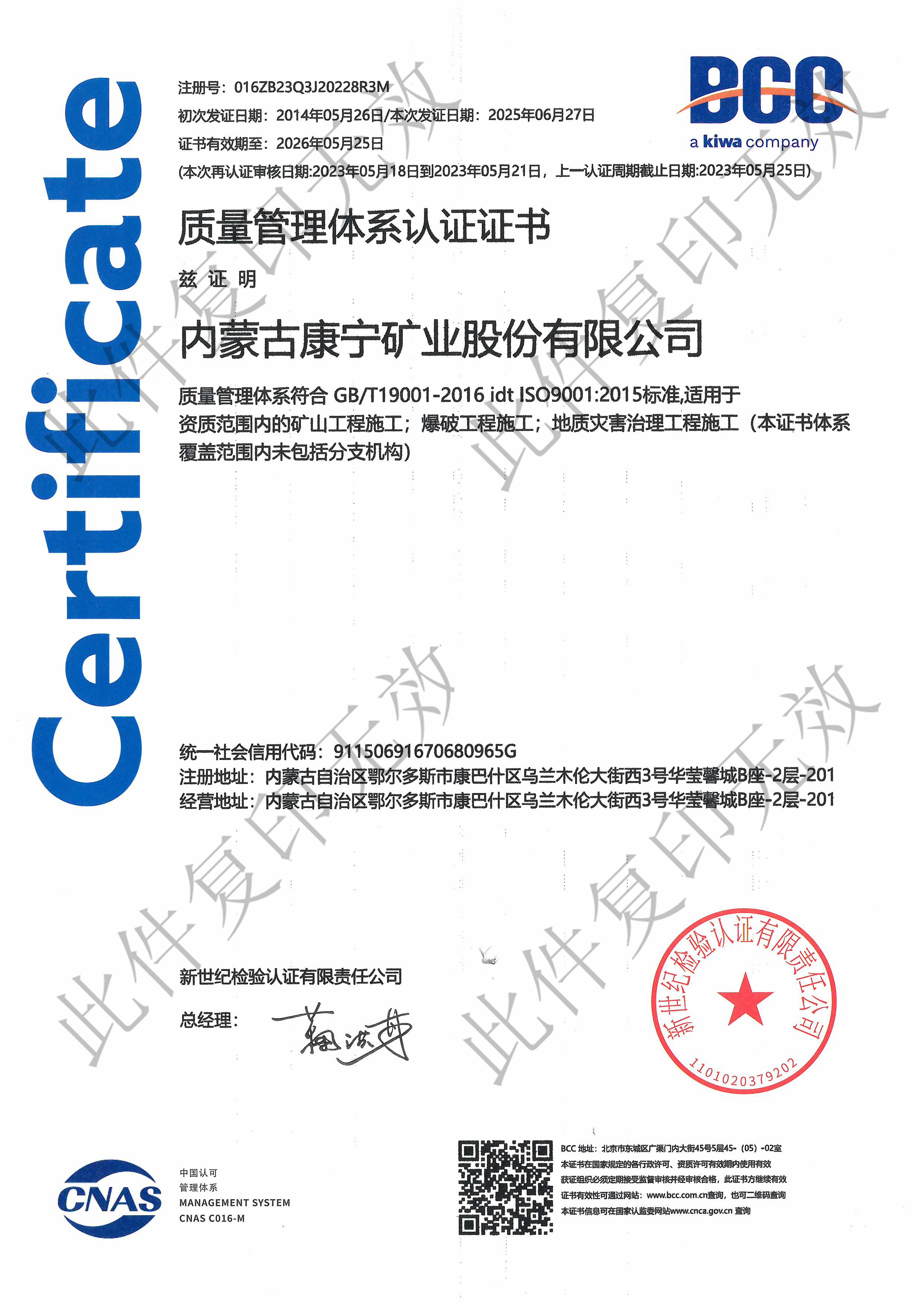 质量管理体系认证证书